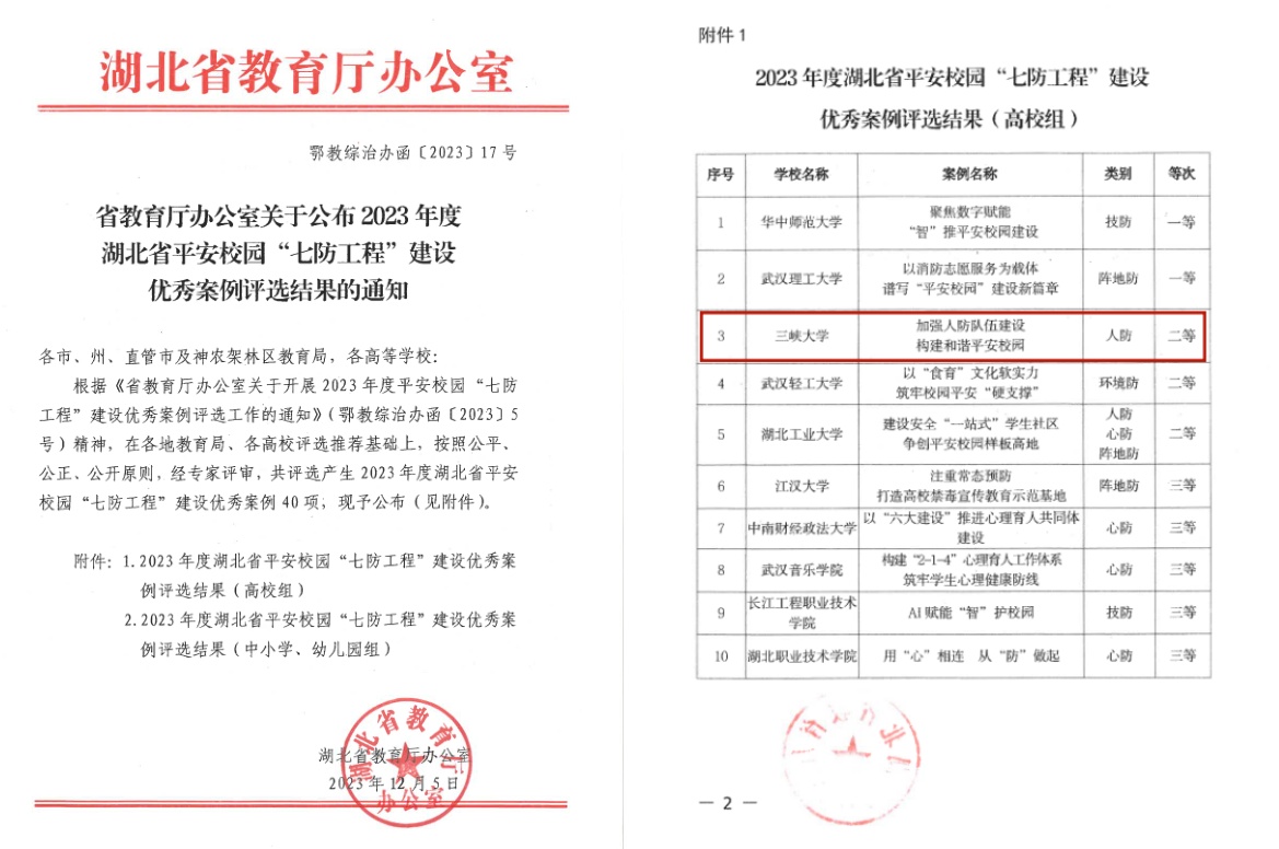 近日,我校选送的“加强人防队伍建设 构建和谐平安校园”案例荣获湖北省2023年度平安校园“七防工程”建设优秀案例二等奖。该评选活动由湖北省教育厅主办,旨在推进平安校园创建工作,为深化教育领域综合改革创造良好环境。