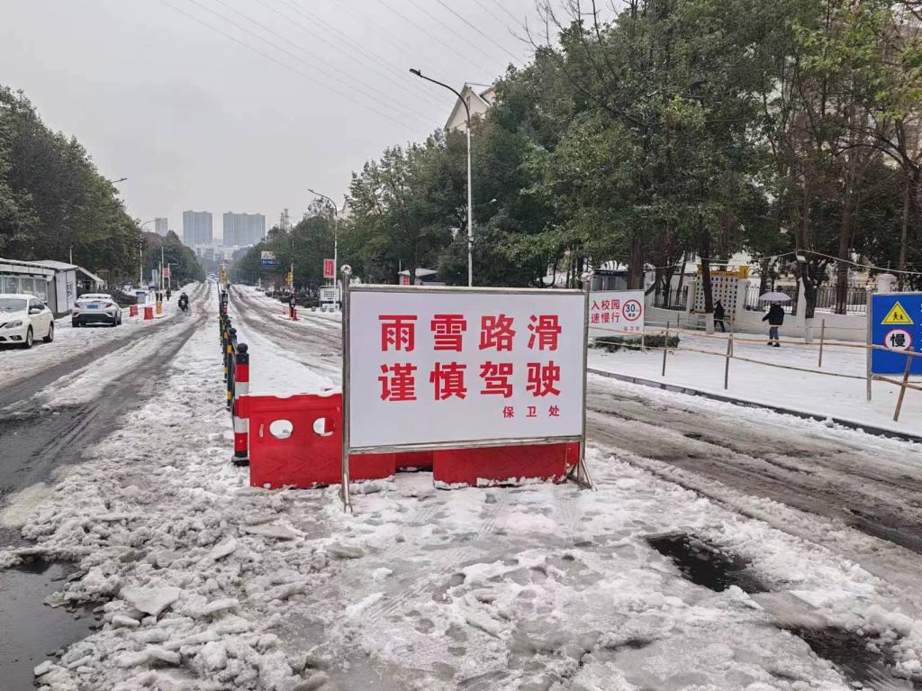 面对极端恶劣天气,保卫处全体人员放弃休假,采取多项应急措施保障校园交通安全。一方面在积雪路段架设安全警示牌,提醒驾驶员减速慢行、谨慎驾驶,全体保卫人员上路指挥疏导交通,确保道路畅通。