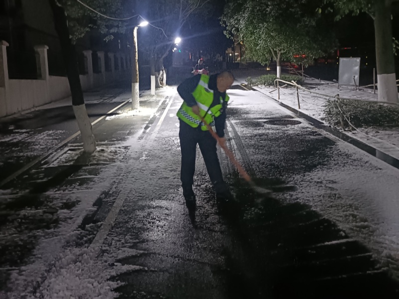 为积极应对极端天气,保卫处提前筹措,准备了冰镐、铁锹、工业盐等抢险应急物资,放置在大学路岗亭备用。当日晚,保卫处组织人员及时在大学路机动车道撒盐融雪,同时对大学路沿线人行道的积雪进行人工清扫,做到雪停路净。