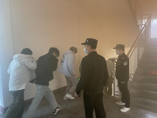 16点整,一阵急促的警报声响起,各楼层负责人、保卫处工作人员到达指定岗位,组织学生迅速进入紧急疏散状态,同时指导楼内学生捂住口鼻快速疏散,有序撤出教学楼,到达安全区域。