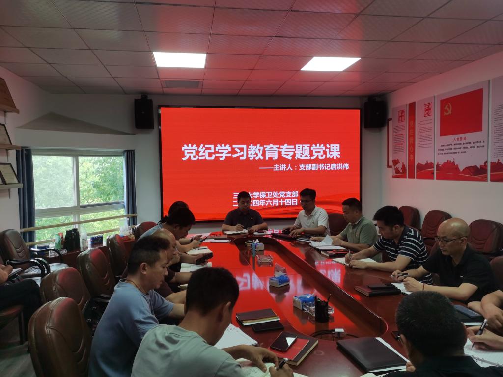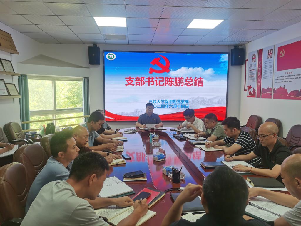 6月14日下午,保卫处党支部在会议室召开党纪学习教育专题党课暨党员评先推优大会,同步开展6月份主题党日活动,支部全体党员参加,会议由支部书记陈鹏主持。
