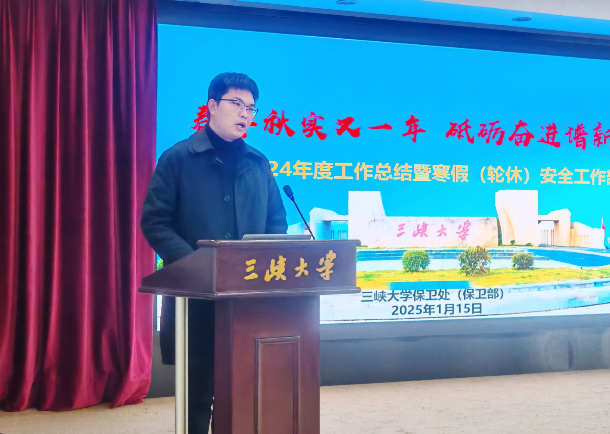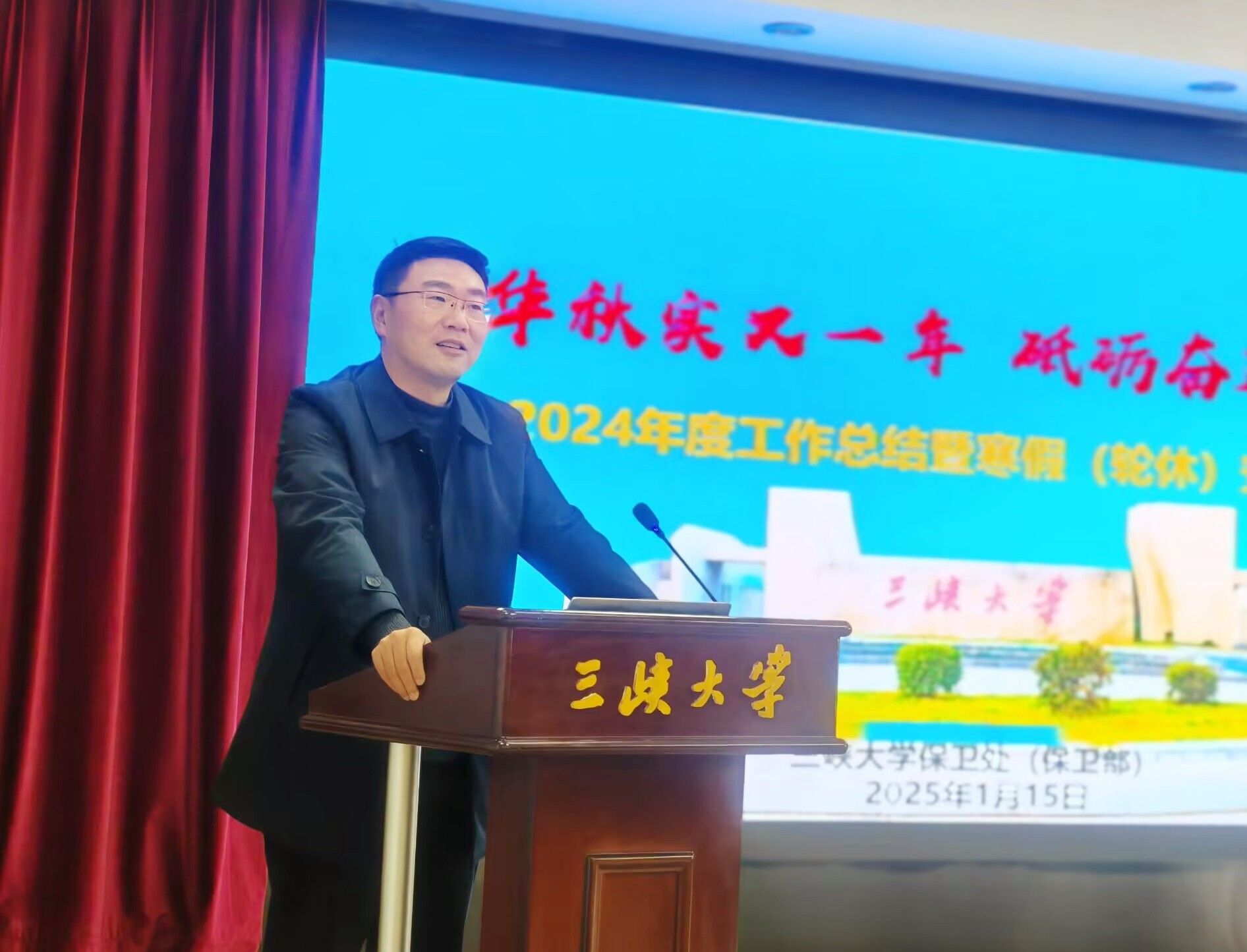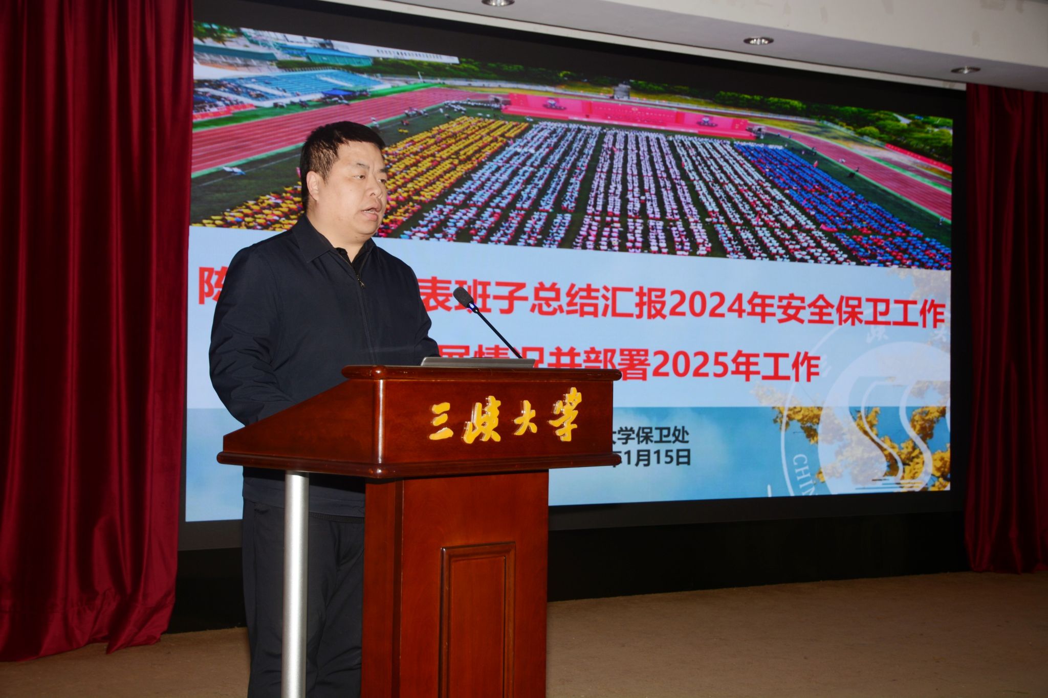 处长陈鹏总结了2024年安全保卫工作十件大事,就政治安全保卫、矛盾纠纷排查化解、安全宣传及文化建设、消防及交通安全管理、大型活动安保勤务、突发事件处置、校园环境治理、社区服务等工作及取得的成果进行了全面回顾总结,指出了过去一年工作中的不足,明确提出2025年重点工作目标、工作措施与突破口,要求全体保卫人员扛牢保障师生安全、护航学校发展的光荣使命,忠诚履责,更好地展现保卫作为,共同实现新的目标。