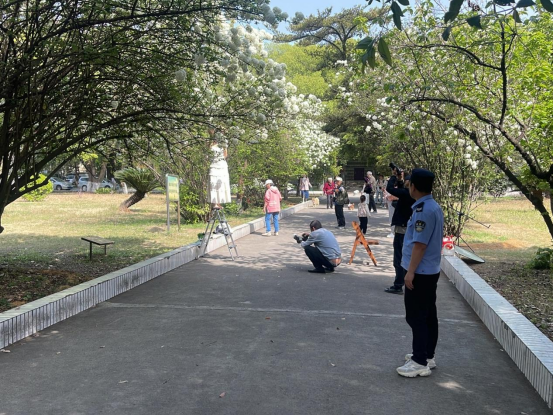 在绣球花集中盛放的区域,保卫处提前设置赏花指引牌,并标注“文明观赏 请勿踩踏”的温馨提示。针对周末游客高峰,采取“分时段限流”措施,安排专人在入口处引导错峰参观,避免人流过度聚集,既保护花根又为拍照留出安全空间。
