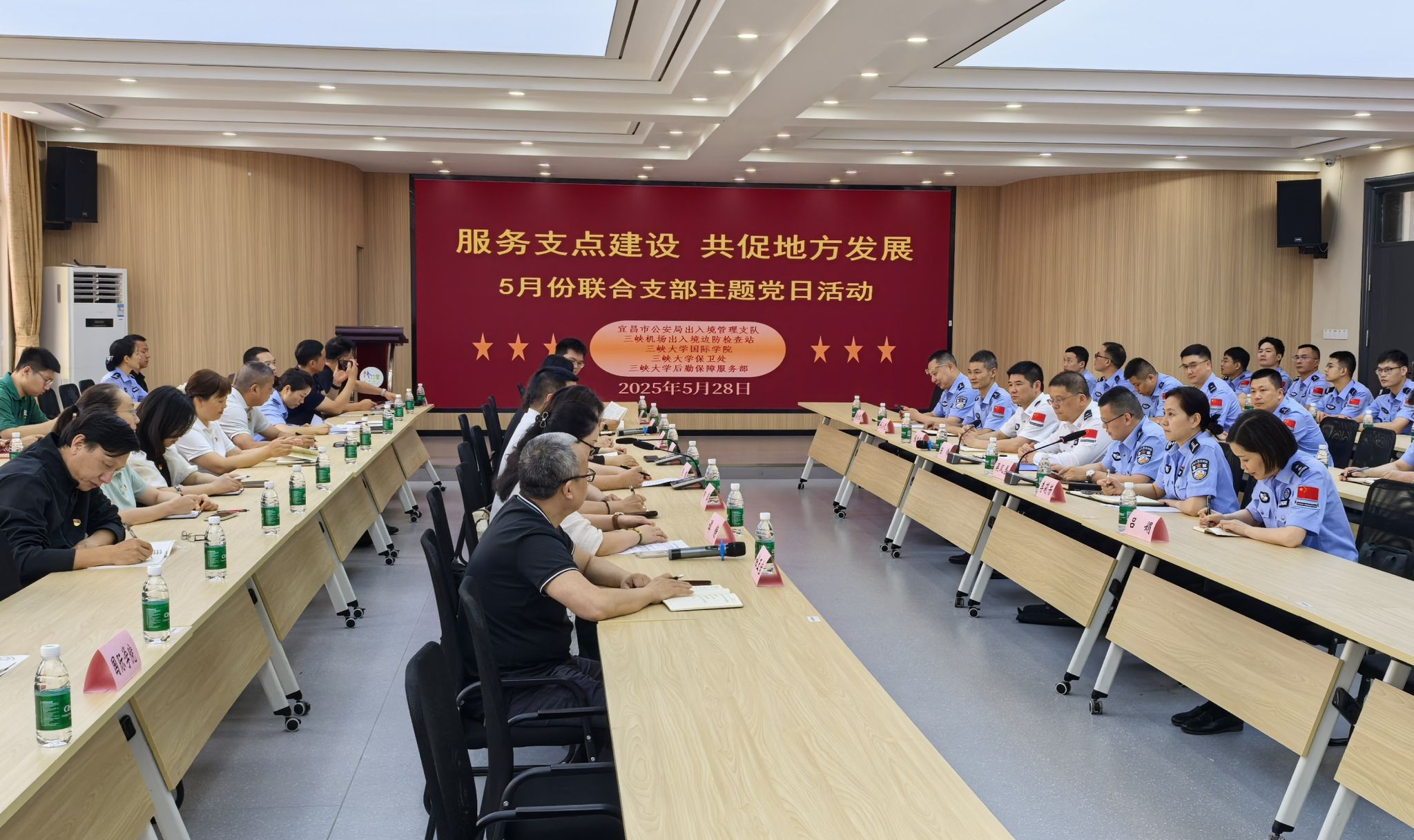 为深化警校地协作机制,提升留学生安全管理与服务水平,5月28日,我校保卫处、国际合作与交流处、后勤保障服务部联合宜昌市公安局出入境管理支队、三峡机场出入境边防检查站在学校工程训练中心开展了“服务支点建设,共促地方发展”联合支部主题党日活动。