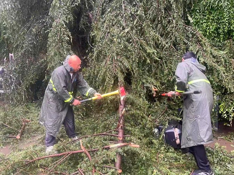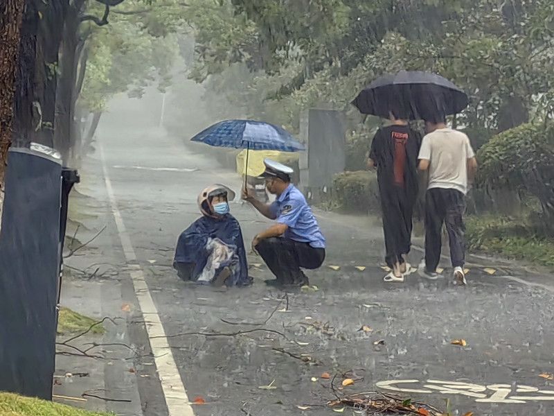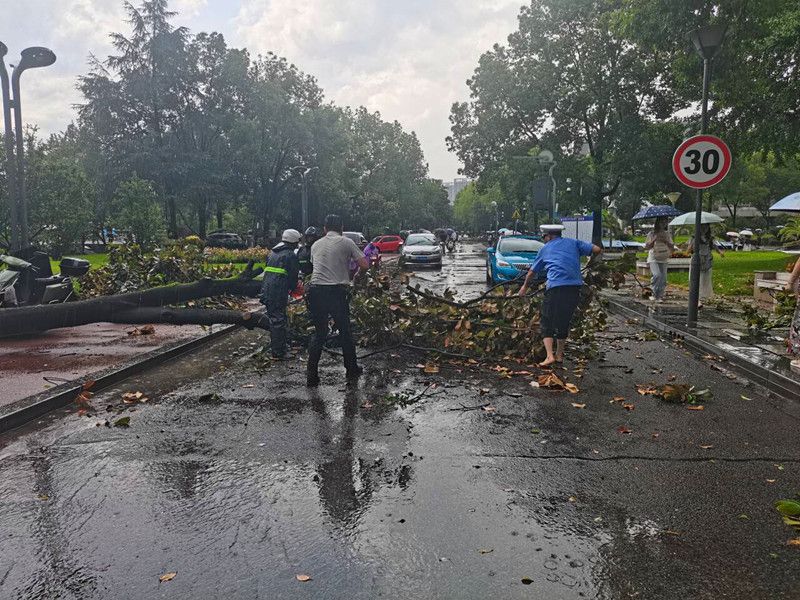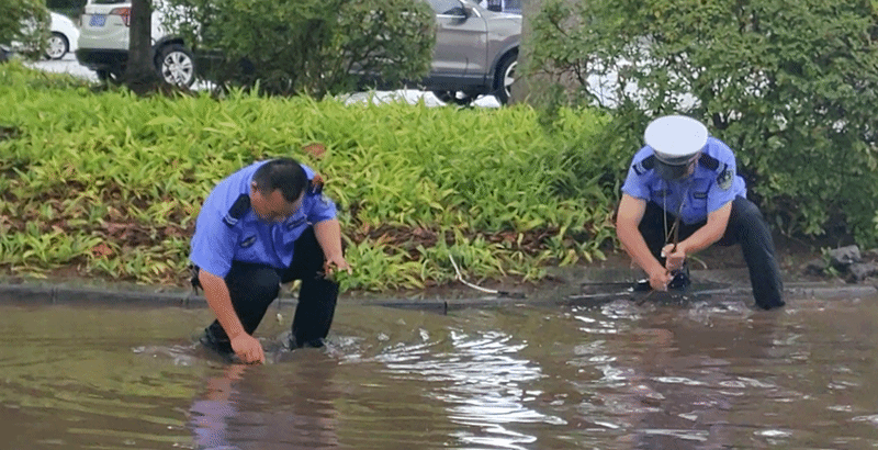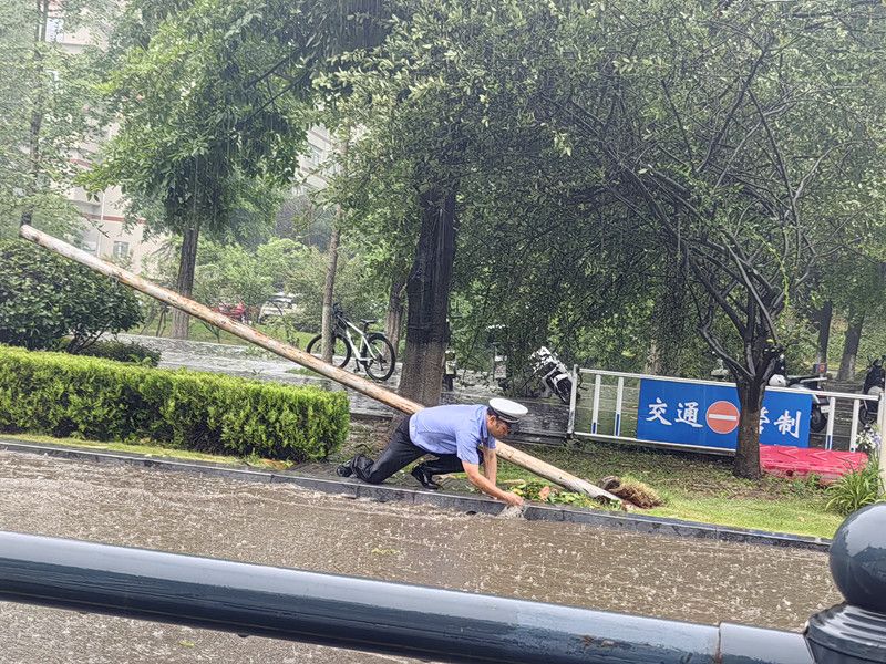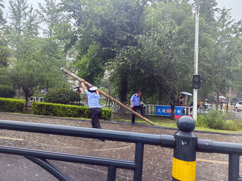 保卫人员对大学路沿线进行巡视,在逸夫楼路口时,发现一名女生瘫坐在暴雨中,队员立马上前撑伞询问身体状况并拨打120求助,陪着她直到送上救护车才放心离去;在积水路段,放置交通管制牌,维持交通秩序;校卫队员清除道路排水沟堆积的淤泥、杂物;清理倒塌的树木杆子,排除路障,恢复道路正常通行。同时,安排专人对易滑坡落石路段等重点区域开展巡逻排查,及时处置并有效控制了次生灾害的发生;经过4小时清理疏通,校园道路积水完全消退,车辆及行人通行恢复正常。