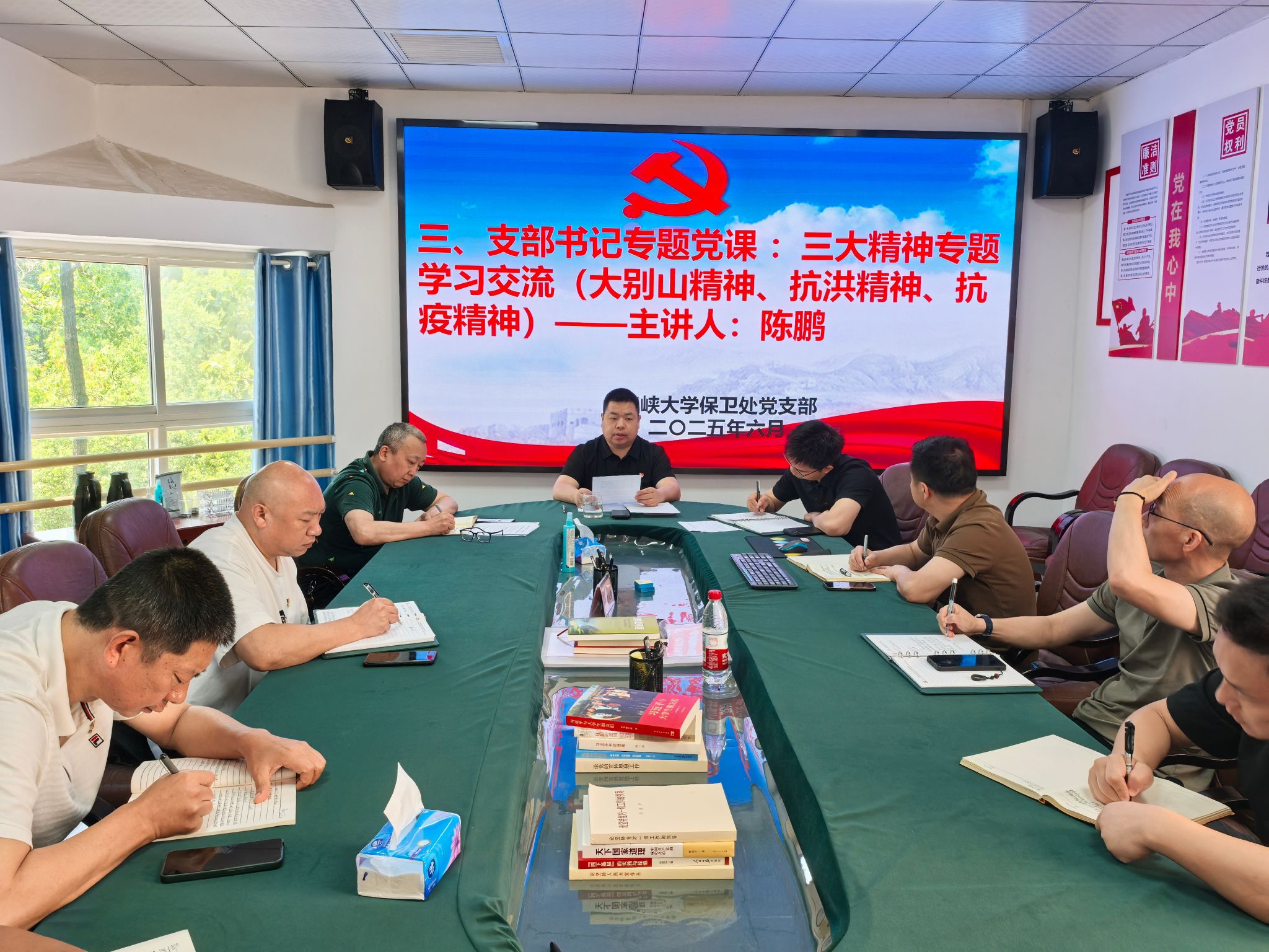 最后,支部书记陈鹏围绕三大精神进行了专题党课。从大别山地区军民坚守信念、无私奉献的革命精神,到抗洪抢险中众志成城、顽强拼搏的坚韧意志,再到抗疫过程里舍生忘死、团结协作的伟大力量,每一种精神都深深触动着在场的每一位党员。面对当前极端天气频发的情况,书记特别强调,保卫人员要将三大精神融入日常工作,坚守岗位,保持高度警惕。一旦校园出现突发状况,必须第一时间响应,做到“哪里有情况就出现在哪里,越是艰险越向前”,始终将校园平安、师生安全放在首位。