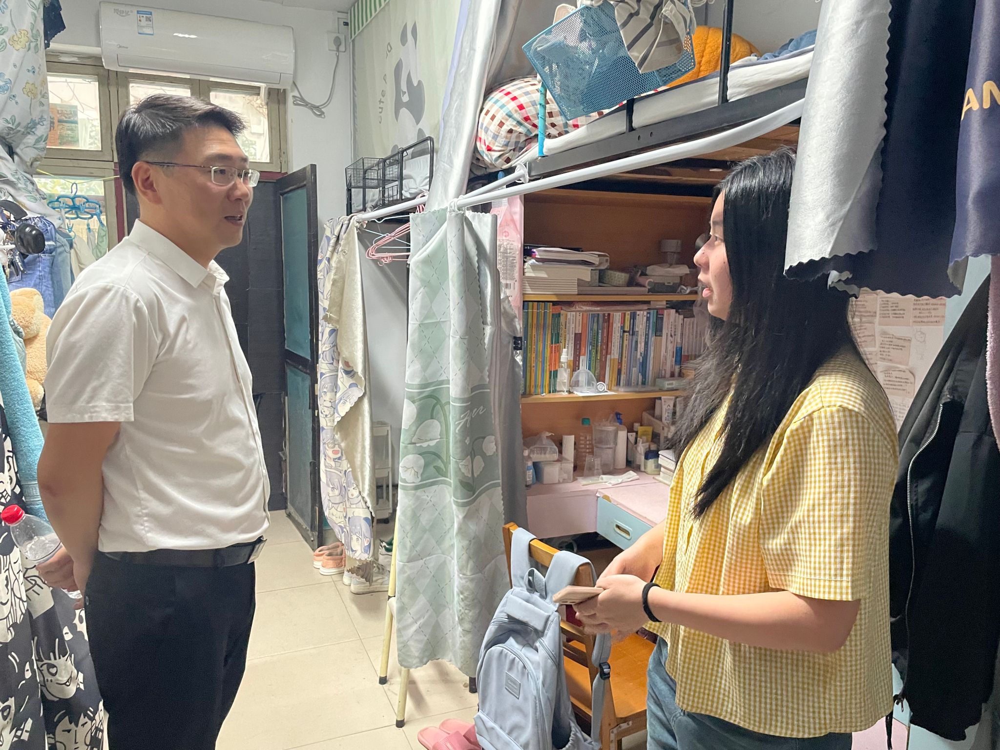 检查组一行深入暑期师生主要活动场所、后勤服务保障区域及施工改造现场,重点对食品安全、施工安全管理、学生住宿情况及实验室安全等进行了全面检查。在欣苑食堂,张锐详细了解了暑期食材采购、储存、加工流程及消防安全措施,强调要严格把控食品安全关,确保暑期餐饮供应优质、安全;在沁苑食堂施工现场,他要求施工单位严格落实安全生产责任制,在保证工程质量和进度的同时,切实做好施工人员的安全防护;在沁苑学生公寓,他与留校学生亲切交谈,细致询问他们的学习生活情况,并叮嘱相关部门做好服务保障;在水利与环境学院实验室和学生工作室,他仔细检查了设备运行及安全管理情况,要求师生严格遵守实验操作规程,强化安全意识,杜绝安全隐患。